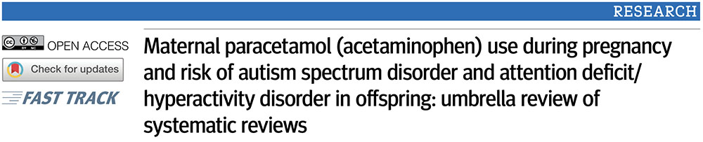 To assess the quality, biases, and validity of evidence on maternal paracetamol (acetaminophen) use during pregnancy and the risk of autism spectrum disorder (referred to as autism) and attention deficit/hyperactivity disorder (ADHD) in offspring.