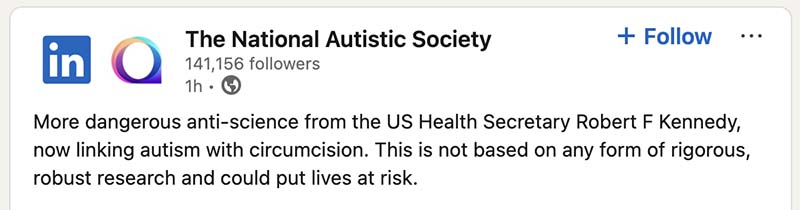 More dangerous anti-science from the US Health Secretary Robert F Kennedy, now linking autism with circumcision. This is not based on any form of rigorous, robust research and could put lives at risk.